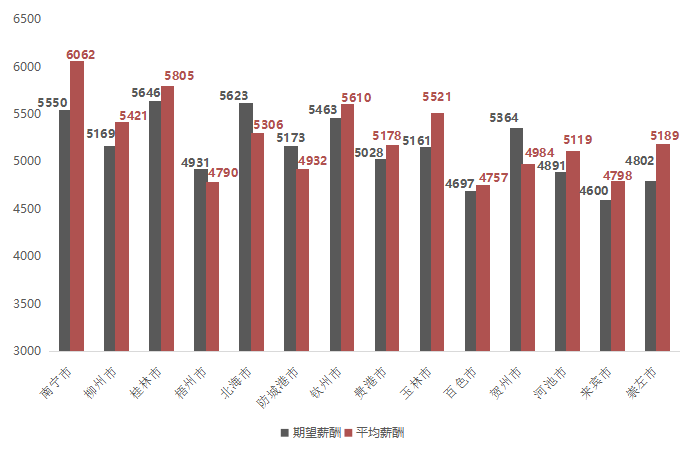 广西人才网中区内主要工作地对应的求职者期望薪酬中位值和职位平均薪酬中位值水平分布图如下(单位:元/月):