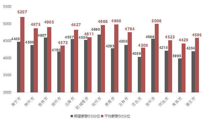 广西区内各市的用人单位提供的薪酬水平分布中,南宁市用人单位发布职位薪酬的中位值(其定义见注5,下同)最高,为5207元/月,环比微跌0.08%,其求职者期望薪酬中位数为4483元/月。