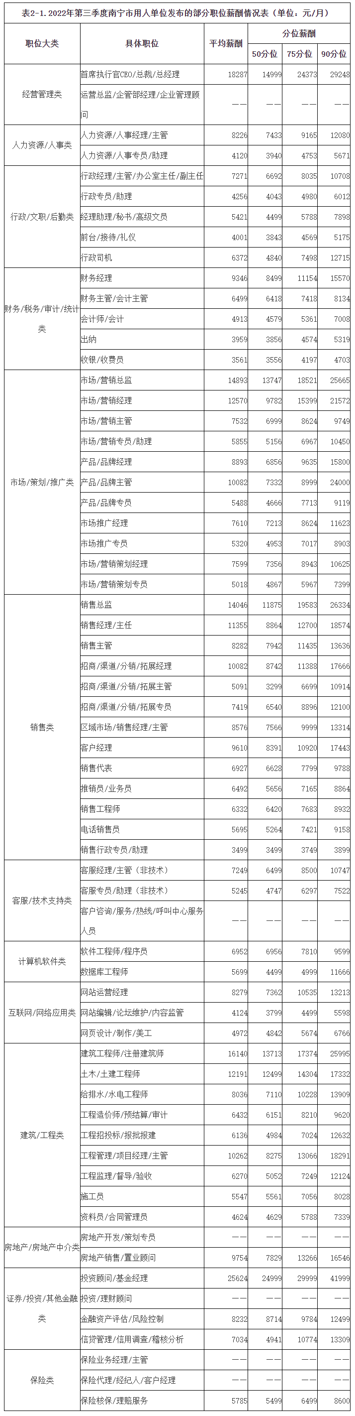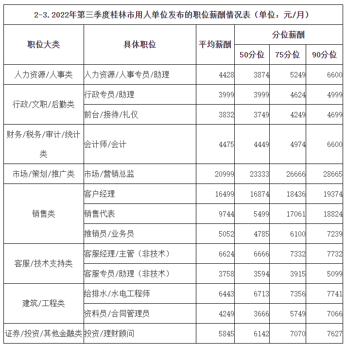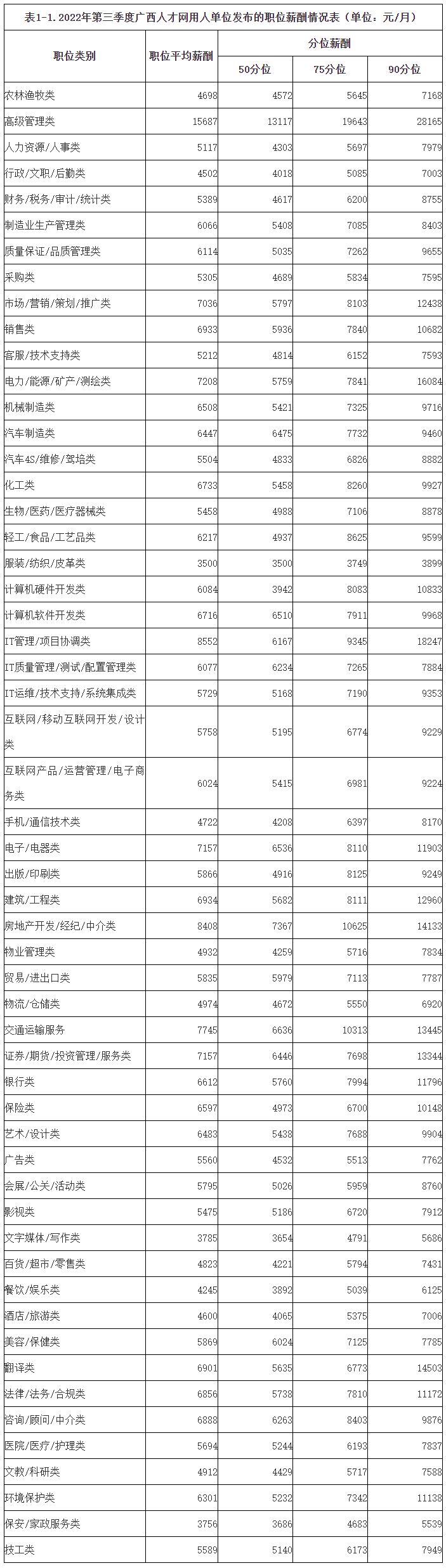 注3:本报告数据来源于广西人才网,经去除重复、不完整以及无效数据、违反国家法律法规的不合理数据,限定单个职位样本量个数(单个职位薪酬数据限定为至少25个样本,低于25个样本的职位薪酬数据不予统计,行业惯例为7个)等数据处理方式,确定2022年第三季度超过10万个符合要求的职位薪酬数据信息作为统计样本。在统计指标上,同时采用平均薪酬和分位薪酬统计方式。