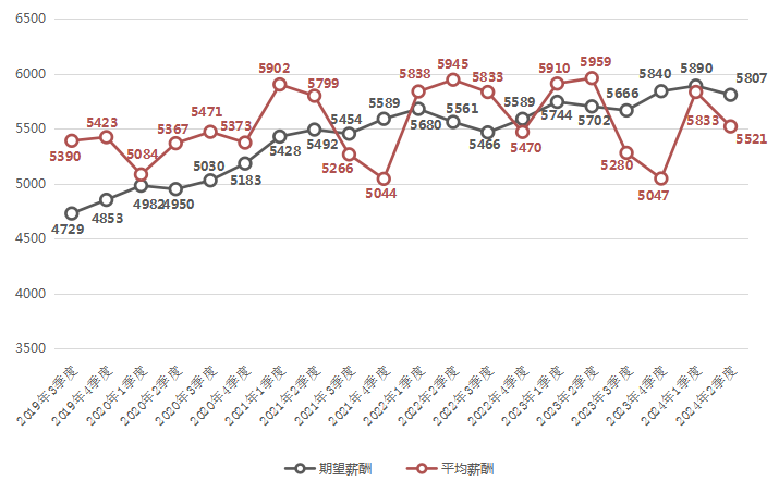 2024年第二季度广西人才网中用人单位发布职位的平均薪酬(其定义见注4,下同)为5521/月,环比下降5.36%,同比下降7.37%;而求职者期望薪酬(其定义见注4,下同)为5807元/月,环比下降1.40%,同比增长1.85%。
