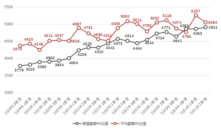 近五年求职者期望薪酬和用人单位发布职位薪酬中位值对比走势图如下:
