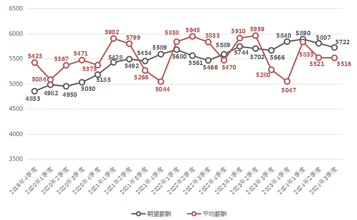 2024年第三季度,广西人才网中用人单位发布职位的平均薪酬水平保持平稳,下降幅度并不明显,仅从上一季度的5521元/月降至本季度的5516元/月,环比微降0.09%。