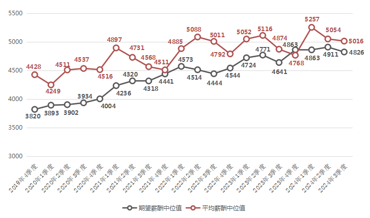 近五年求职者期望薪酬和用人单位发布职位薪酬中位值对比走势图如下: