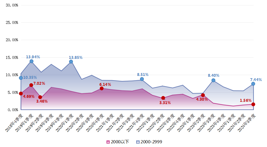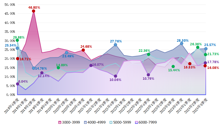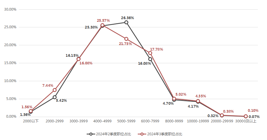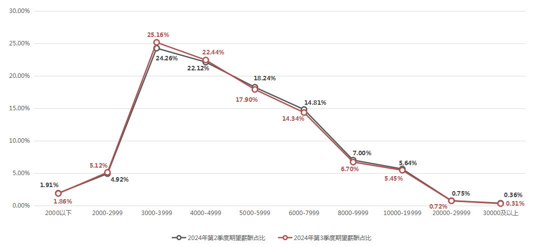 2024年第三季度,求职者期望的薪酬区间占比保持平稳,主要集中在3000-3999元/月区间,该区间的求职者期望薪酬占比达到25.16%。