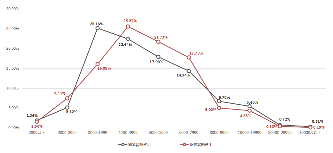 注4:职位平均薪酬指的是所属职位类别中用人单位发布职位的薪酬样本加权平均值,不代表单个职位的实际薪酬,例如高级管理类职位平均薪酬为10142元/月,但其有很多副总以上级别的高薪职位薪酬更高。期望薪酬指的是求职者期望从事职位类别的薪酬样本加权平均值。