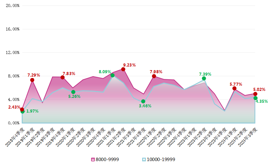 本季度,房地产开发/经纪/中介类职位的平均薪酬环比小幅增长,从上季度的5587元/月上升至本季度的5792元/月,小幅增长3.67%。其中,该职位类别下的房地产销售经理平均薪酬增长较为明显,其平均薪酬为12388元/月,环比大幅增长94.34%。