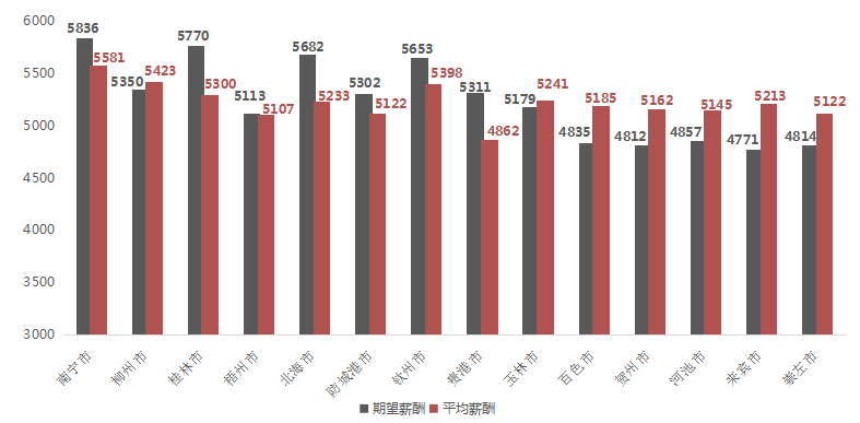 广西人才网中区内主要工作地对应的求职者期望薪酬和职位平均薪酬水平分布图如下(单位:元/月):