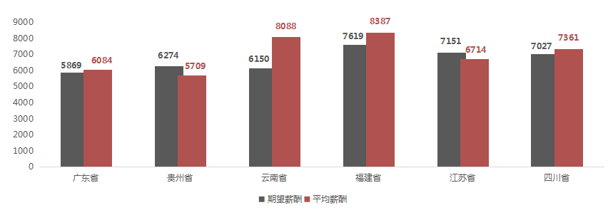 广西人才网中区外主要工作地对应的求职者期望薪酬和职位平均薪酬水平分布图如下(单位:元/月):