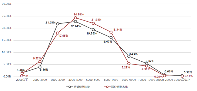注4:职位平均薪酬指的是所属职位类别中用人单位发布职位的薪酬样本加权平均值,不代表单个职位的实际薪酬,例如高级管理类职位平均薪酬为10798元/月,但其有很多副总以上级别的高薪职位薪酬更高。期望薪酬指的是求职者期望从事职位类别的薪酬样本加权平均值。