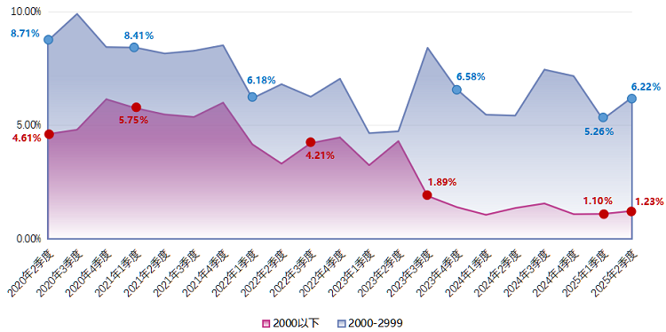 2025年第二季度,求职者期望的薪酬区间占比集中度较高,3000-3999元/月区间、4000-4999元/月区间和5000-5999元/月的求职者期望薪酬合计占比63.35%。