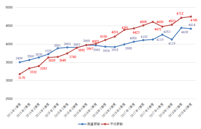 近五年各季度求职者期望薪酬和用人单位发布职位平均薪酬对比走势图如下: