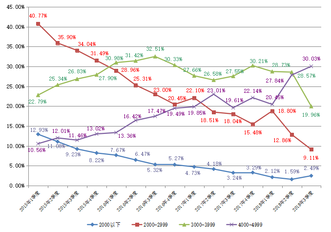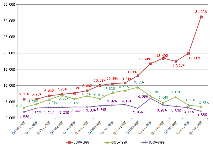 2018年第三季度广西人才网联系统中用人单位发布职位的平均薪酬(其定义见注4,下同)为4745元/月,环比小幅增长2.28%,而求职者期望薪酬为4414元/月,环比微降0.54%。用人单位提供的职位平均薪酬水平依旧比求职者的期望薪酬略高。