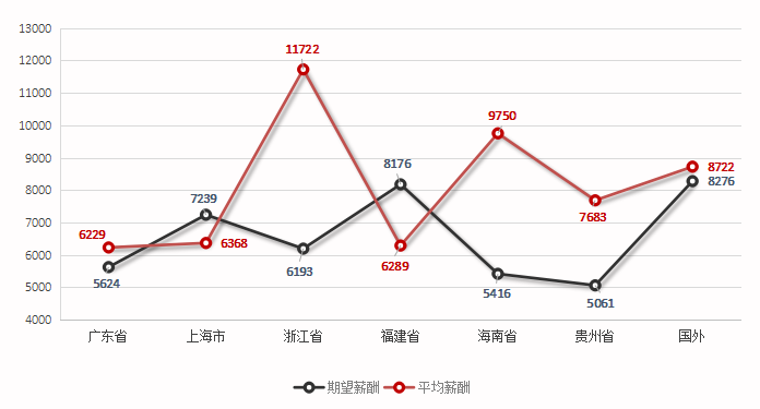 广西人才网中区外主要工作地对应的求职者期望薪酬和职位平均薪酬水平分布图如下(单位:元/月):