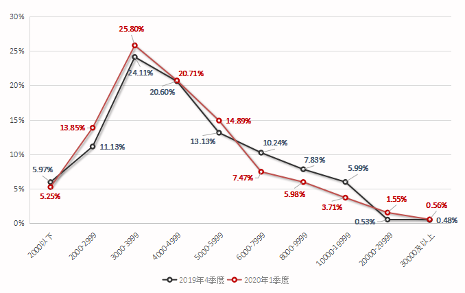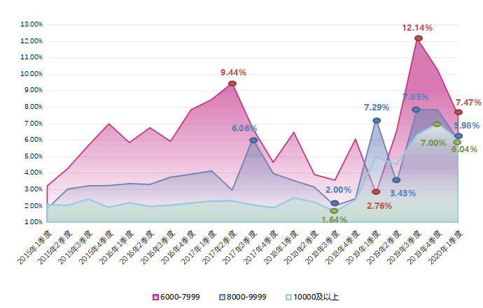 由上图可见,2020年第一季度6000-7999元/月区间的职位数量占比为7.47%,环比下滑2.77个百分点;8000-8999元/月区间薪酬的职位占比为5.98%,环比下滑1.85个百分点;10000及以上元/月区间的职位占比为6.04%,环比下滑0.96个百分点。