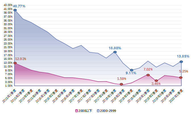 由上图可见,近六年2000-2999元/月较低薪酬区间在2020年第一季度职位数量占比出现小幅上扬,但占比仅为13.85%;2000元/月以下占比仅为5.25%。