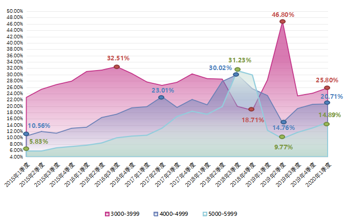 近六年各季度较高薪酬区间(单位:元/月)的职位数量占比曲线图如下: