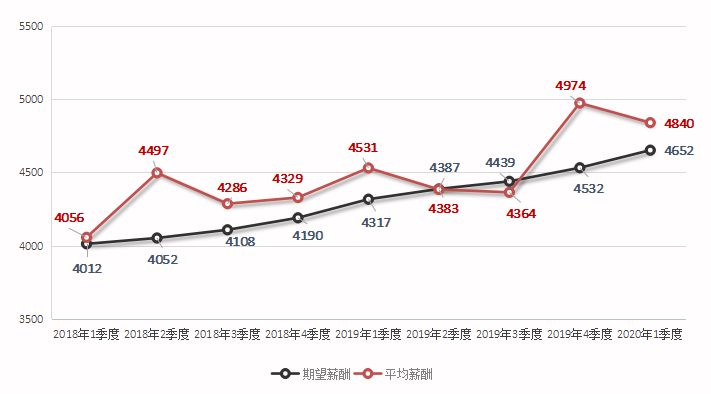 近六年各季度求职者期望薪酬和用人单位发布职位平均薪酬对比走势图如下:
