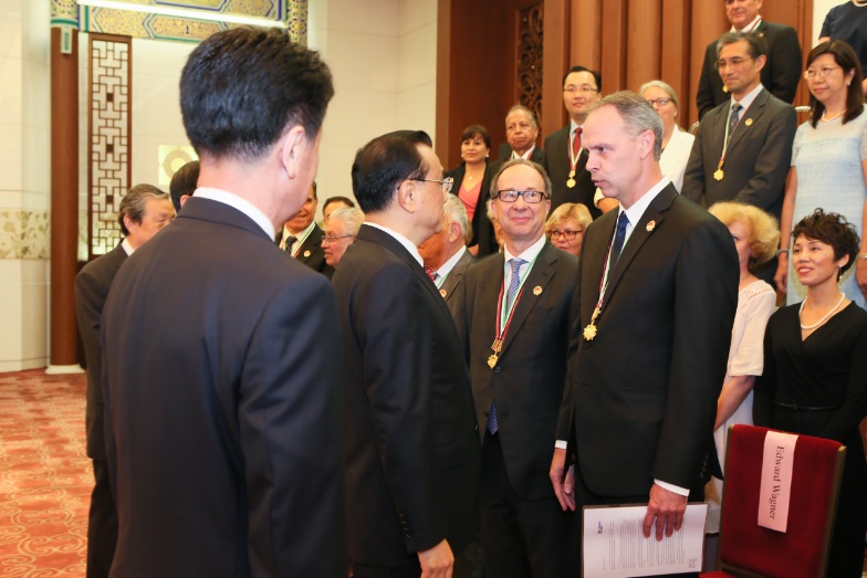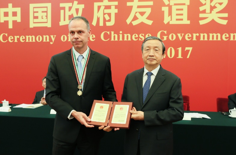 图为中共中央政治局委员、国务院副总理马凯(右)向荣获2017年度中国政府“友谊奖”专家、广西柳工机械股份有限公司副总工程师、新技术与试验技术总监爱德华颁奖爱德华(左)颁奖