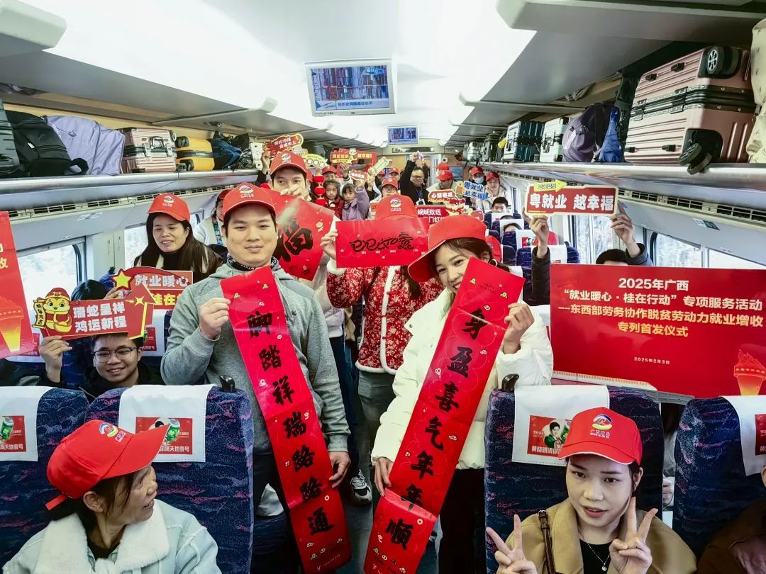 2025年2月3日正月初六,广西东西部劳务协作脱贫劳动力就业增收专列首发仪式在来宾北站举行,本次活动由广西壮族自治区人力资源和社会保障厅、广东省人力资源和社会保障厅、广西壮族自治区人民政府驻广州办事处、来宾市人民政府、中国铁路南宁局集团有限公司主办,广西壮族自治区人力资源和社会保障厅党组成员、副厅长韦杰,来宾市人民政府副市长杨远艳等出席活动。