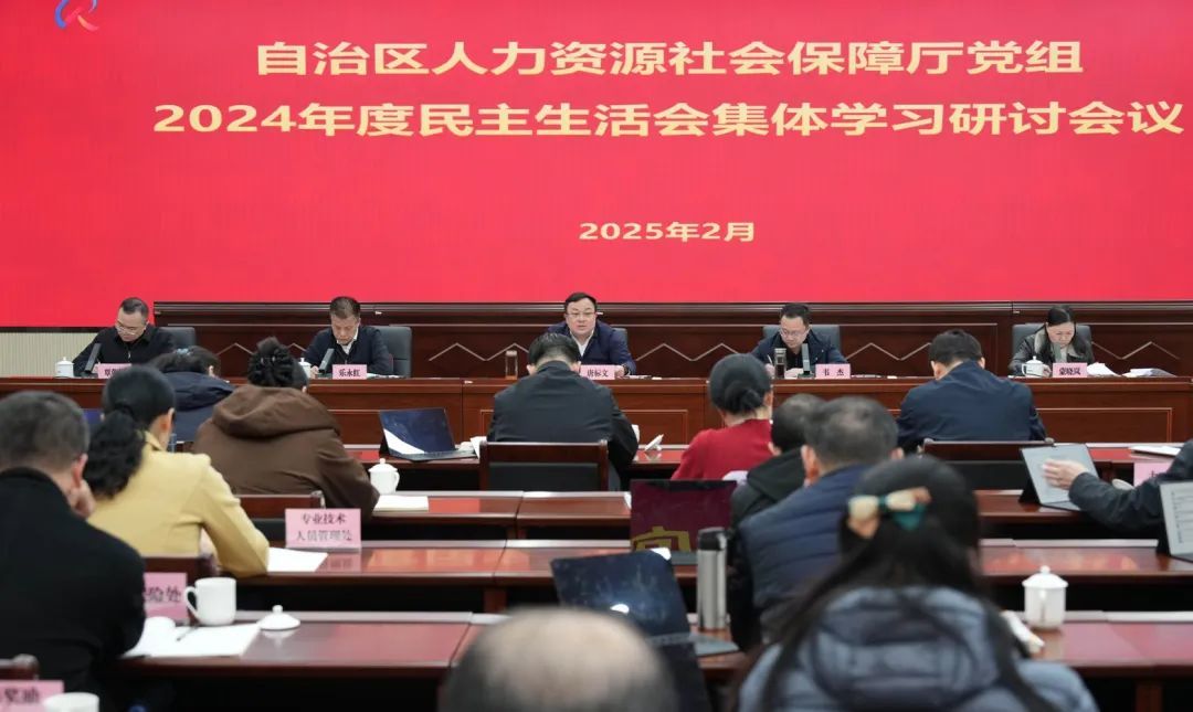 2月6日,自治区人力资源社会保障厅党组召开2024年度民主生活会集体学习研讨会议,坚持把学习贯彻习近平新时代中国特色社会主义思想和党的二十届三中全会精神贯穿民主生活会始终,一体学习领会习近平总书记关于党的建设的重要思想、关于党的自我革命重要思想以及关于全面加强党的纪律建设的重要论述、关于全面深化改革的一系列新思想新观点新论断,学习领会习近平总书记最新重要讲话精神以及关于人力资源社会保障工作的重要论述和关于广西工作论述的重要要求,增强以党的自我革命引领社会革命的自觉性坚定性,切实把思想和行动统一到党中央决策部署上来,打牢开好民主生活会的思想基础。厅党组书记、厅长唐标文作学习研讨发言及学习小结,厅党组副书记、副厅长袁国华作书面发言,厅党组成员、副厅长韦杰,厅党组成员、副厅长、一级巡视员乐永红,驻厅纪检监察组组长、厅党组成员蒙晓岚,厅党组成员、副厅长覃朝俊作学习研讨发言。