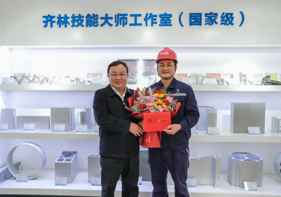 厅党组书记、厅长唐标文(左一)慰问全国技术能手、国家级技能大师工作室领办人、广西南南铝加工有限公司航空航天零部件项目首席技师齐林