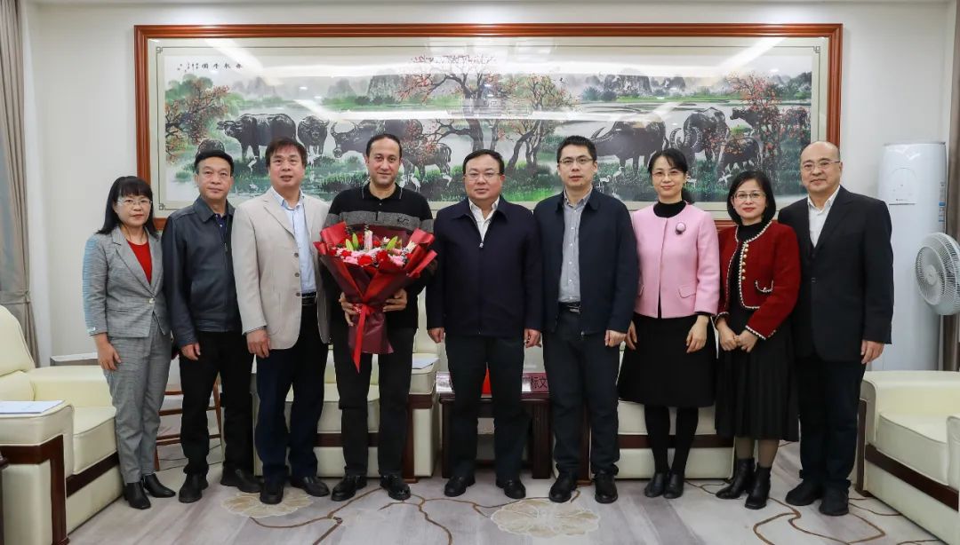 厅党组书记、厅长唐标文(中)慰问自治区水牛研究所国际杰青、埃及籍专家艾哈迈德·阿明博士