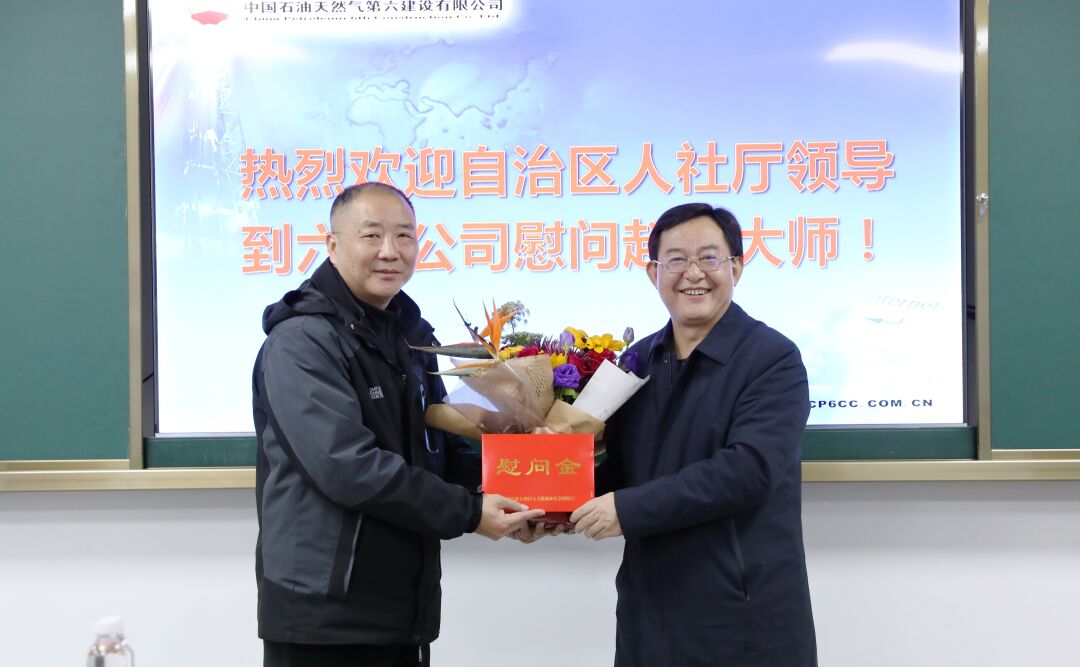 厅党组副书记、副厅长袁国华(右一)慰问中国石油第六公司首席技能专家、国家级技能大师工作室领办人赵辉