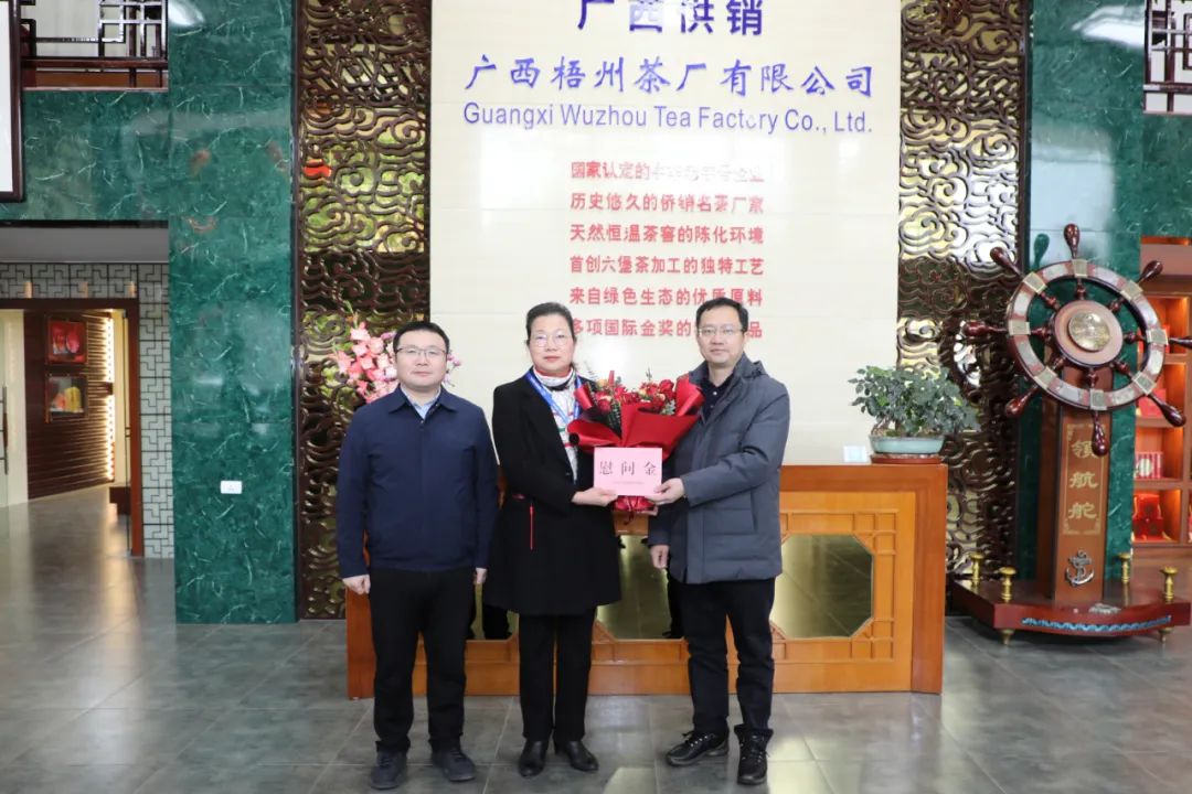 厅党组成员、副厅长韦杰(右一)慰问享受政府特殊津贴专家、广西梧州茶厂有限公司正高级工程师何梅珍