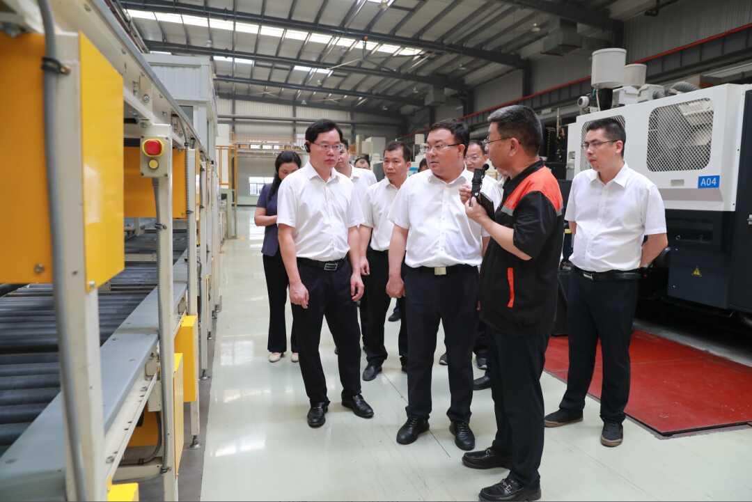 唐标文(前排左二)在吉利百矿集团有限公司了解汽车轮毂生产流程