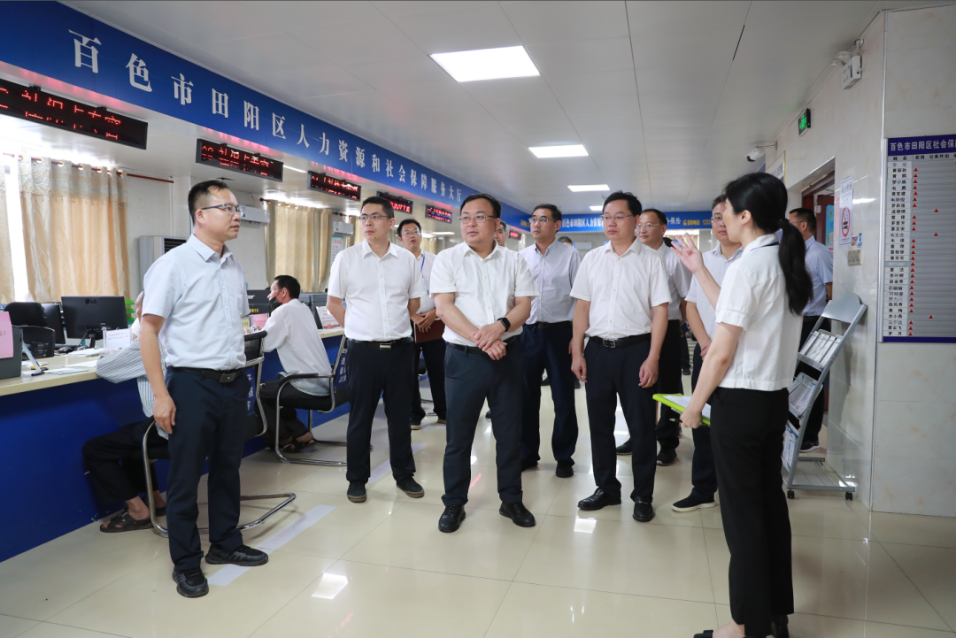 唐标文(左四)在百色市田阳区人力资源和社会保障服务大厅听取运行情况介绍