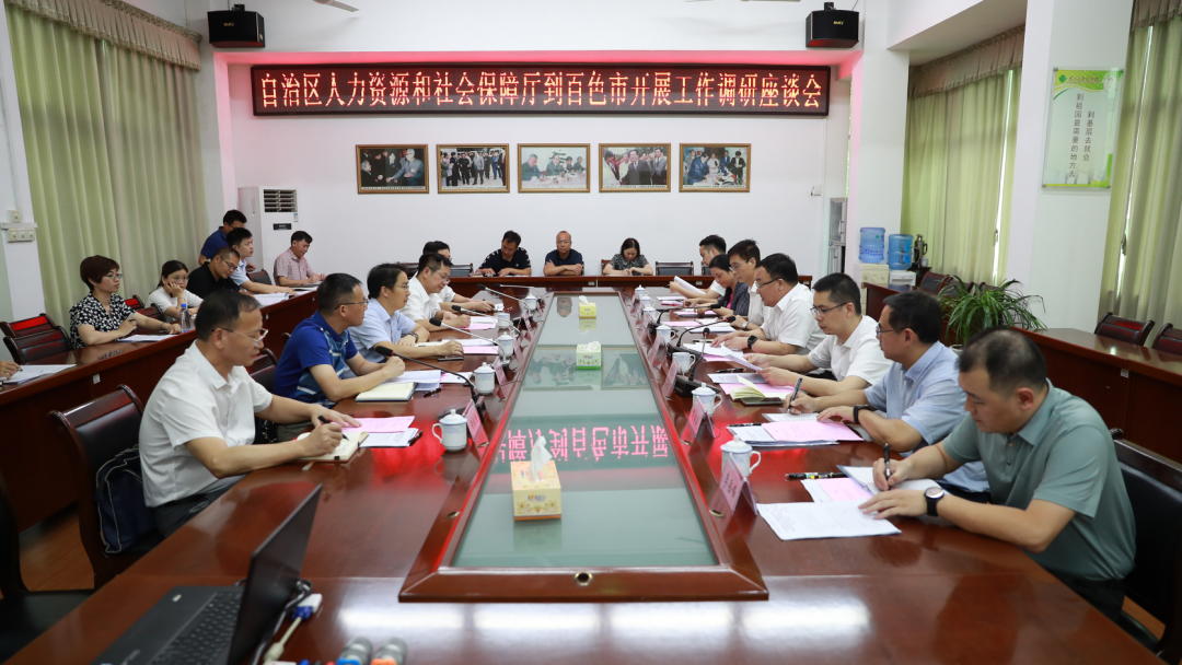 座谈会上,调研组听取了百色市政府、百色学院、右江民族医学院、百色市人力资源和社会保障局、田阳区政府相关工作汇报,百色相关单位的与会人员围绕调研重点及工作中的堵点、困难提出了意见建议。