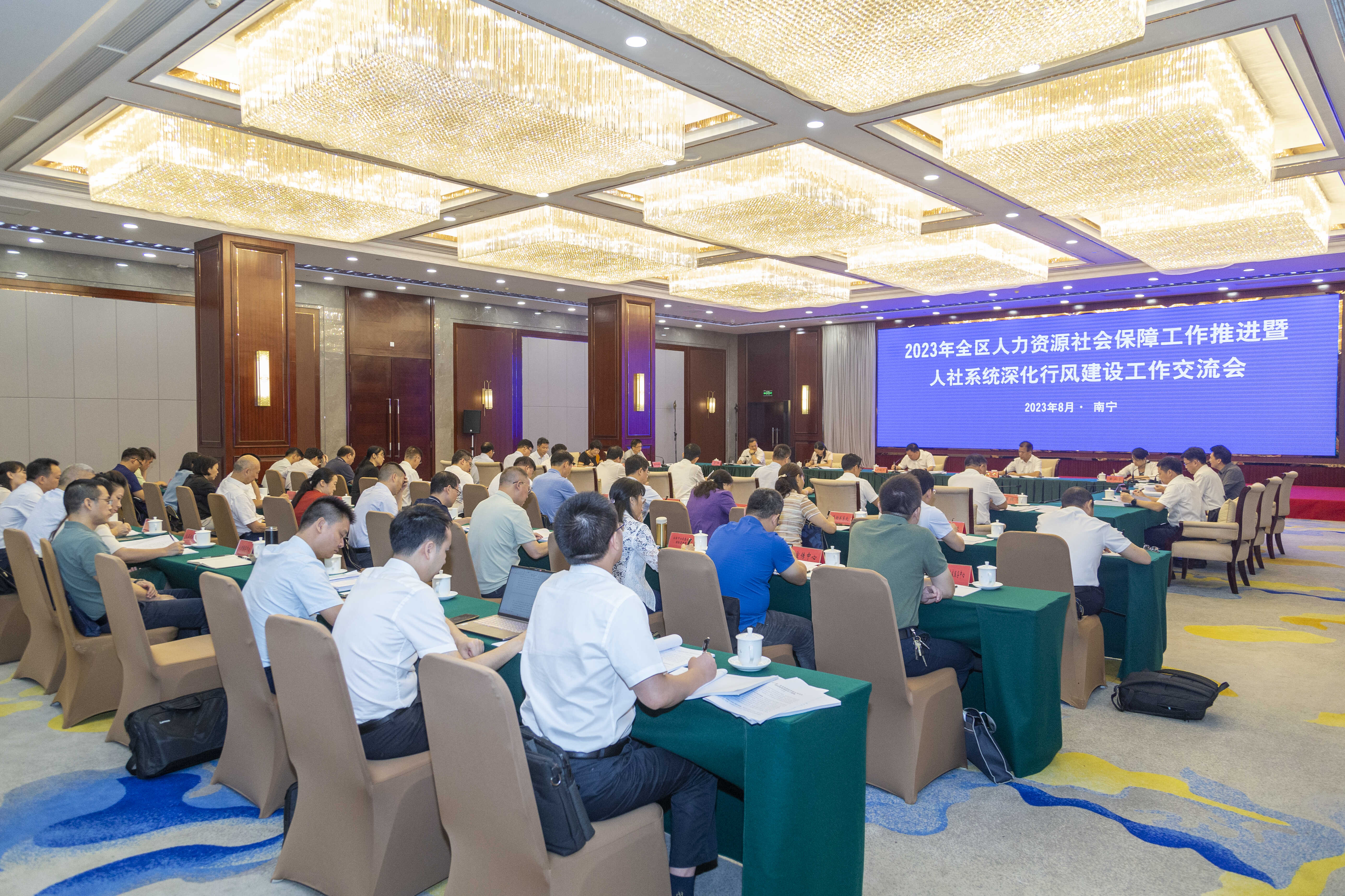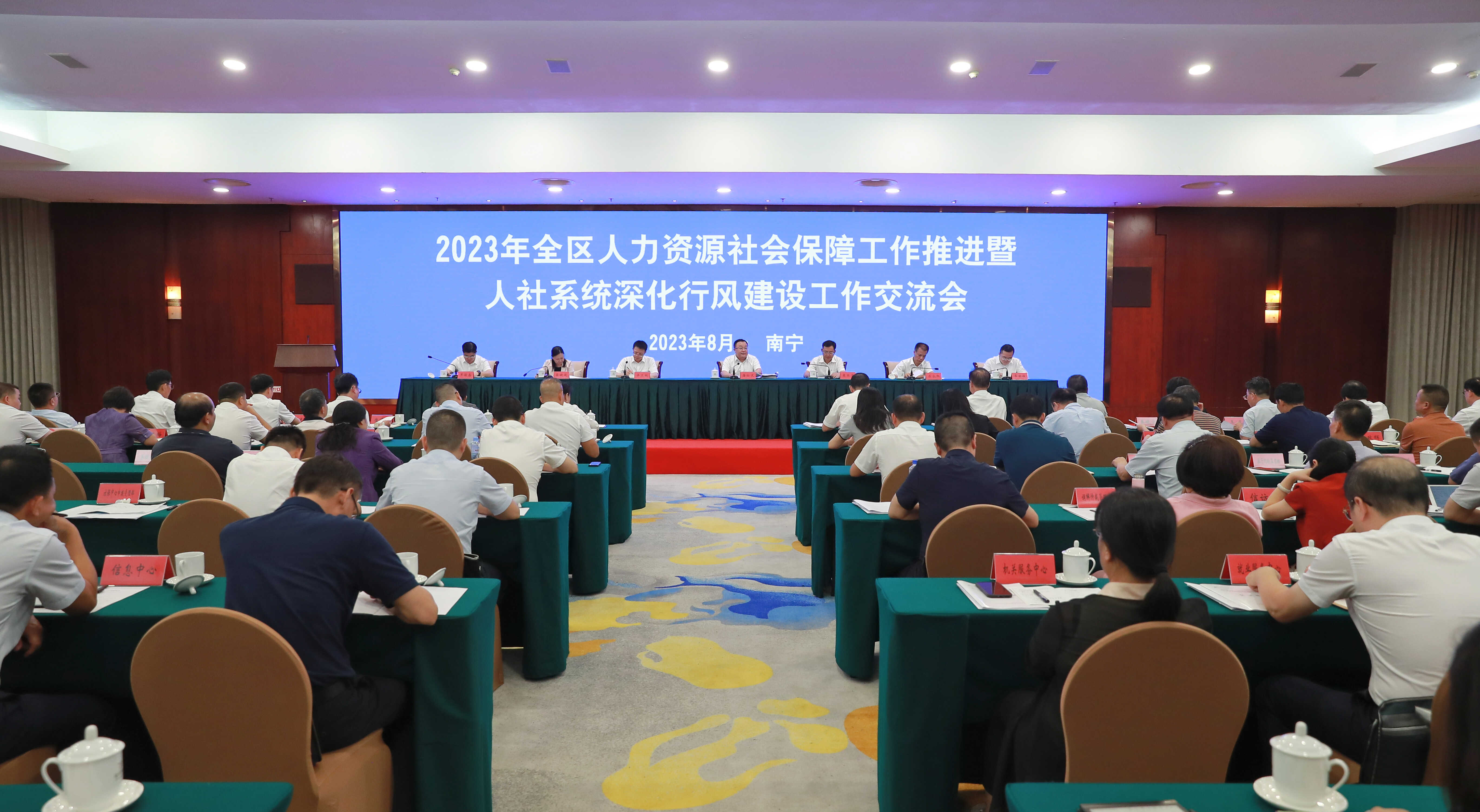 8月11日,2023年全区人力资源社会保障工作推进暨人社系统深化行风建设工作交流会在南宁召开。会议主要任务是:以习近平新时代中国特色社会主义思想为指导,全面贯彻落实党的二十大精神,深入学习贯彻习近平总书记对广西“五个更大”重要要求、视察广西“4·27”重要讲话和对广西工作系列重要指示精神,认真贯彻落实人力资源社会保障部务虚会暨人社系统全面从严治党深化行风建设工作会议、高校毕业生等青年就业工作部署推进会以及自治区党委十二届六次全会暨全区年中工作会议精神,总结2023年以来全区人社工作,分析当前形势,研究部署重点工作,动员全区人社系统在新时代新征程上踔厉奋发、勇毅前行,在边疆民族地区人社事业高质量发展中展现更大作为。自治区人力资源社会保障厅党组书记、厅长唐标文出席会议并讲话。厅党组副书记、副厅长袁国华主持会议。