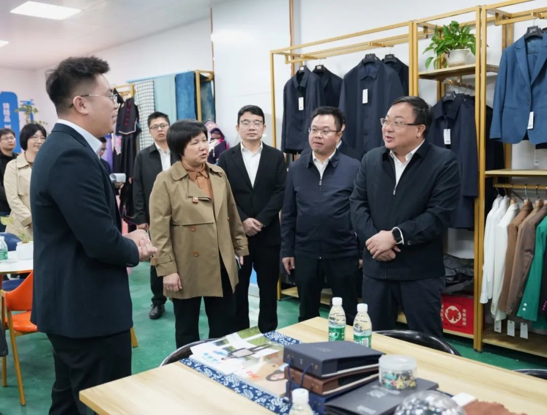 唐标文(右一)在德保县景秋实业服装有限公司询问企业吸纳易地搬迁劳动力就业情况