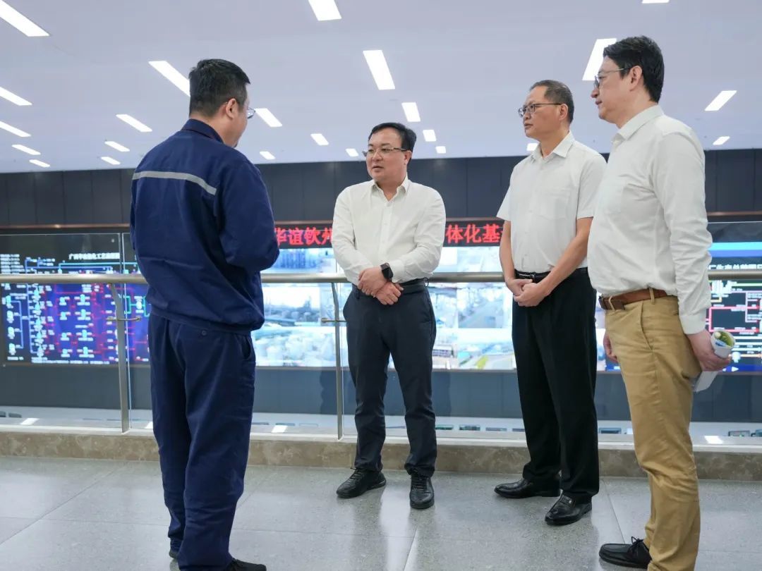 唐标文(左二)在华谊钦州新材料一体化基地总控制室听取企业招工和技能培训情况介绍