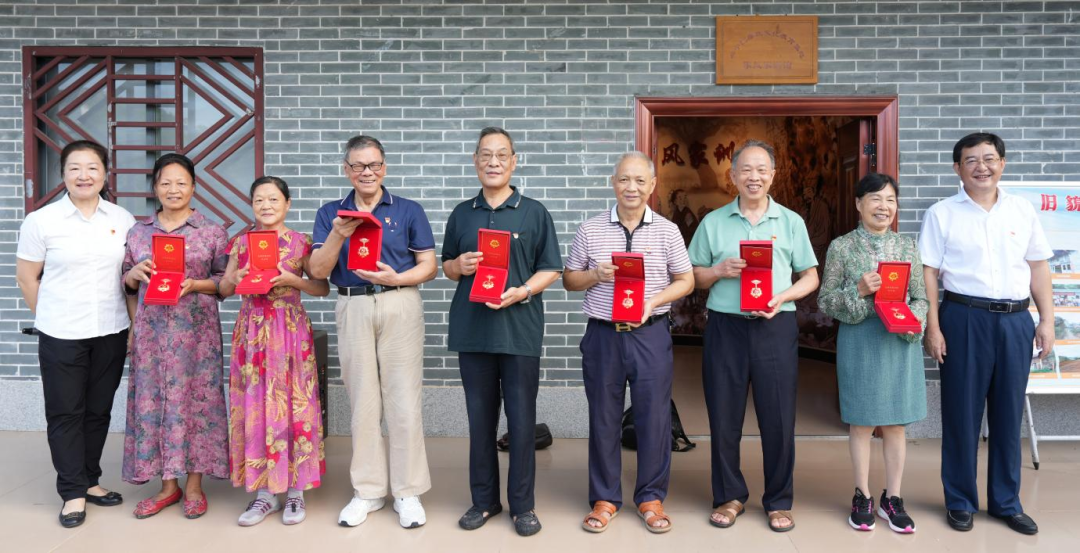 厅党组副书记、副厅长袁国华(右一)向老党员送上 “光荣在党50年”纪念章