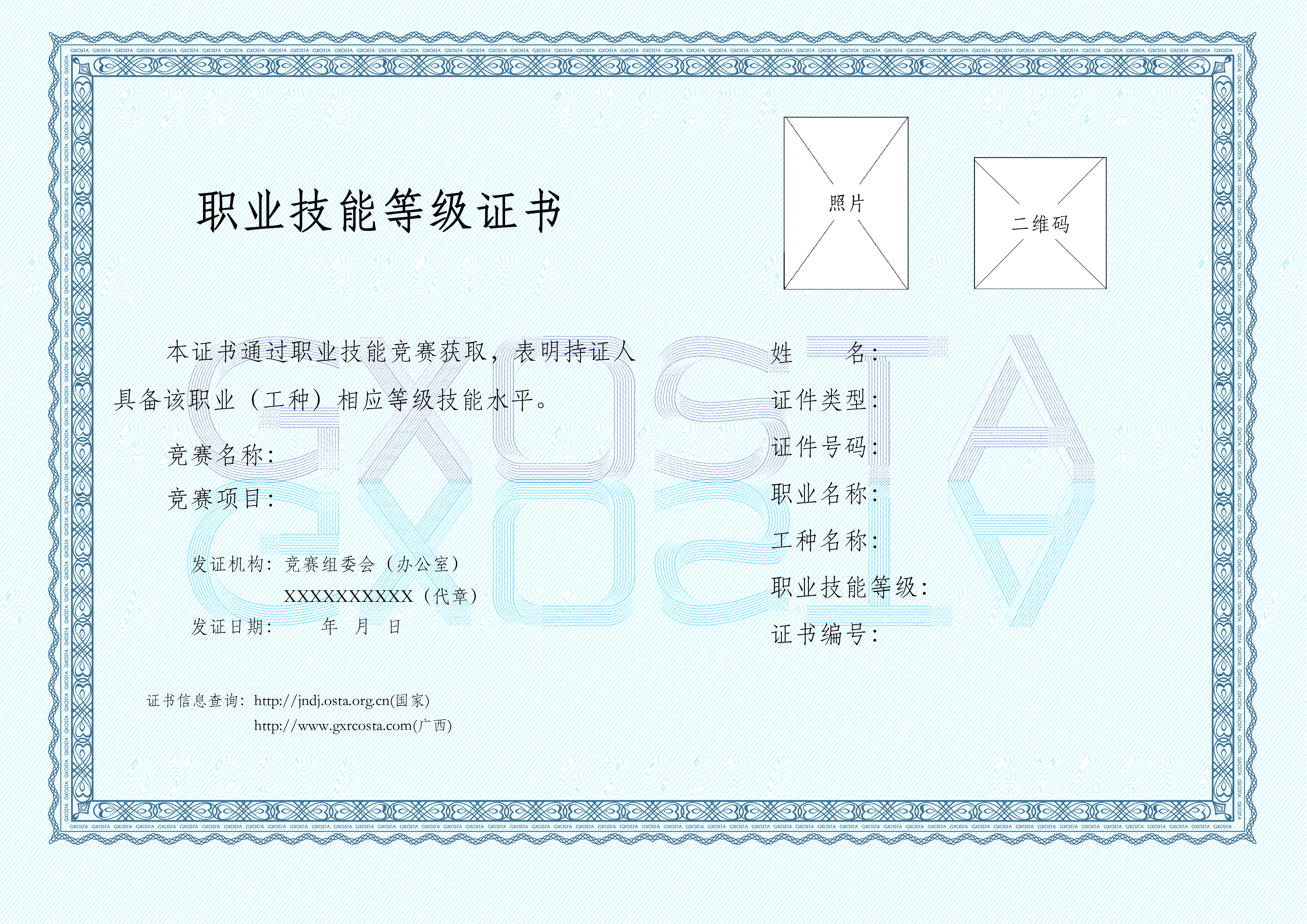 五、职业技能等级制度实施后纳入我区职业技能竞赛计划并符合相关条件的竞赛选手均可按规定颁发职业技能等级职业证书,实行电子证书并纳入广西人力资源和社会保障厅证照库管理。职业技能等级证书编码按人社部要求确定,其中第17位(即证书序号第1位)使用大写英文字母J作为标识码。