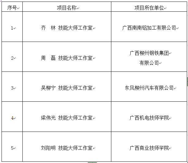 根据我厅《关于做好2020年国家级高技能人才培训基地和技能大师工作室建设项目申报推荐工作的通知》,在各市和各有关单位推荐的基础上,经组织专家评审和公示无异议后,自治区人力资源社会保障厅审批,确定广西玉林技师学院等5所院校为2020年度国家级高技能人才培训基地建设项目(附件1),齐林技能大师工作室等5个工作室为2020年度国家级技能大师工作室建设项目(附件2)。
