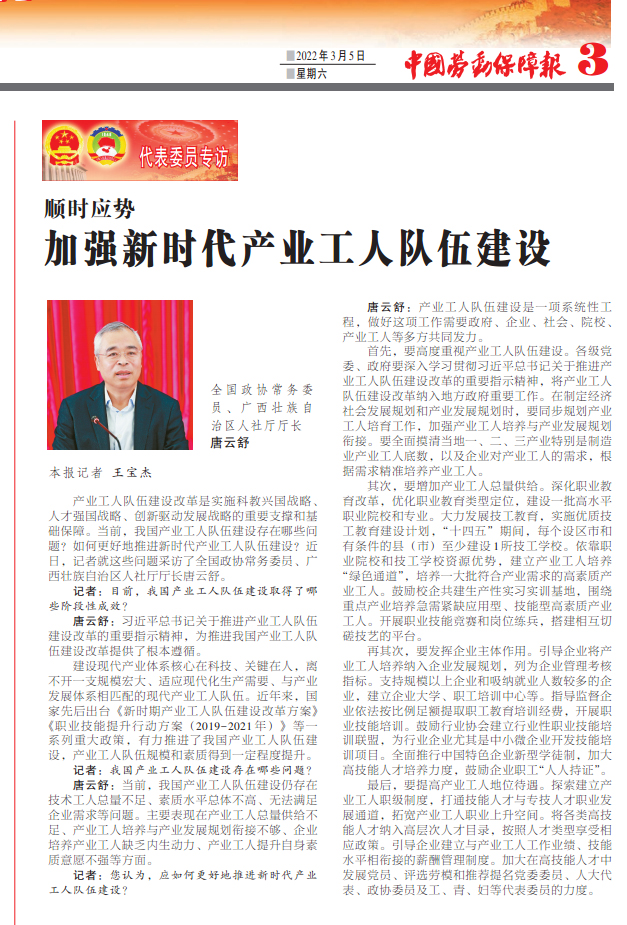 产业工人队伍建设改革是实施科教兴国战略、人才强国战略、创新驱动发展战略的重要支撑和基础保障。当前,我国产业工人队伍建设存在哪些问题?如何更好地推进新时代产业工人队伍建设?近日,记者就这些问题采访了全国政协常务委员、广西壮族自治区人社厅厅长唐云舒。