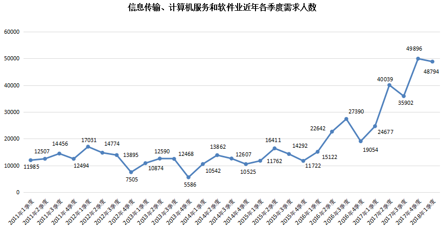 2. 信息传输、计算机服务和软件业人才需求旺盛,其人才需求量达到48794人,需求占比达到20.95%,比上年同期的24677人增加24117人,涨幅高达97.73%。