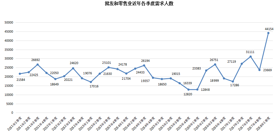 3. 批发和零售业人才需求突破性增长,突破4万大关,其人才需求量达到44154人,比上年同期的17286人增加26868人,涨幅高达155.43%。
