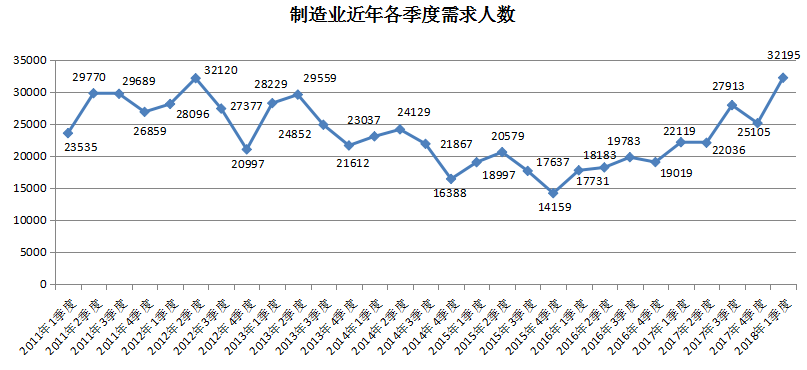 4. 制造业人才需求同比大幅增长,突破历史最高点,其人才需求量达到32195人,同比涨幅达到45.55%。