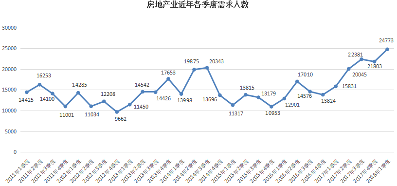 5. 房地产行业需求人才数为24773人,达历年最高值,与去年同期的15831人相比增加8942人,同比涨幅达到56.48%。