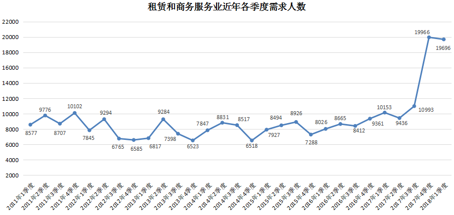 6. 租赁和商务服务行业需求环比虽稍有回落,但同比涨幅明显,其需求人才数达到19696人,与去年同期的10153人相比增加9543人,同比涨幅高达93.99%。
