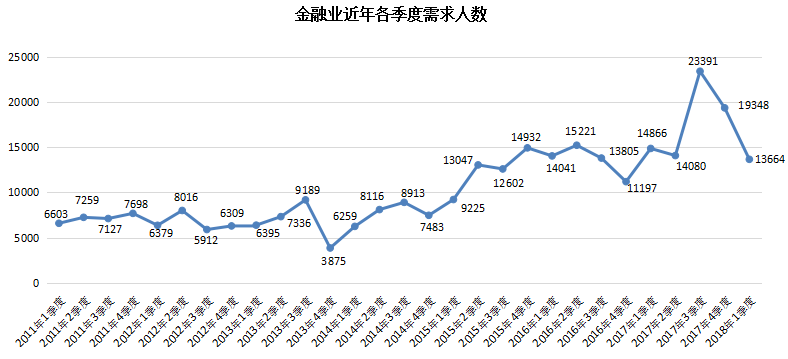 7. 金融业人才需求增长乏力,环比回落明显,其人才需求量为13664人,与去年同期的14866人相比减少1202人,同比小幅下滑8.09%。