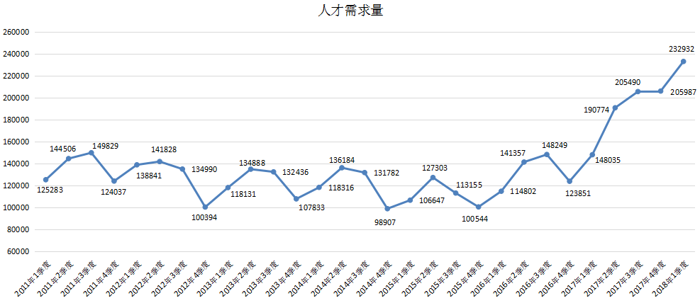 2018年第一季度,通过广西人才网联系统招聘人才的用人单位共13539家,与上年同期相比上涨18.72%。2018年第一季度人才需求量达到232932人,同比涨幅高达57.35%,创历年最高。