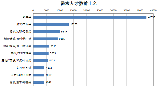 1. 位居需求榜前十名的职位:销售类、建筑/工程类、行政/文职/后勤类、市场/营销/策划/推广类、财务/税务/审计/统计类、客服/技术支持类、房地产开发/经纪/中介类、文教/科研类、人力资源/人事类、百货/超市/零售类等职位类型。这十个职位类型的需求人才数总计103914人,占人才总需求量的44.61%,其中销售类职位需求长期以绝对优势位居首位,其需求人才数达到42355人,占比达到18.18%,比上年同期的34520人增加7835人,增幅为22.70%。