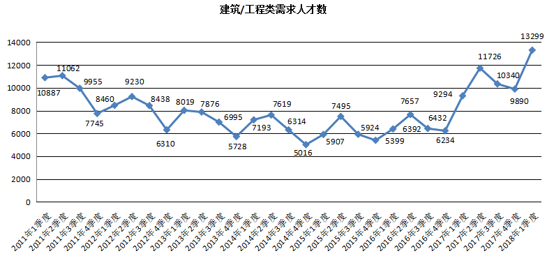 2. 建筑/工程类职位人才需求量为13299人,创历史新高,与上年同期的9294人相比增加了4005人,增幅为43.09%。