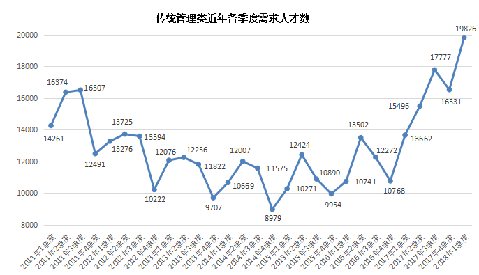 3. 三大传统管理类职位(包含行政/文职/后勤类、人力资源/人事类及财务/税务/审计/统计类等职位类别,下同)的人才需求总量为19826人,创历史新高,与上年同期相比增加6164人,同比涨幅达到45.12%。