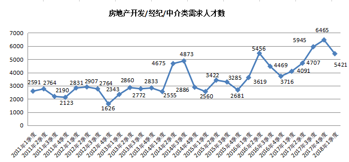 4. 房地产开发/经纪/中介类职位人才需求量为5421人,环比回落明显,环比下降16.15%,但与上年同期的4091人相比仍增加了1330人,增幅为32.51%。