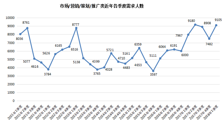 5. 市场/营销/策划/推广类职位人才需求量达到9105人,与上年同期的7967人相比增加1138人,增幅为14.28%。